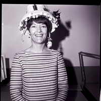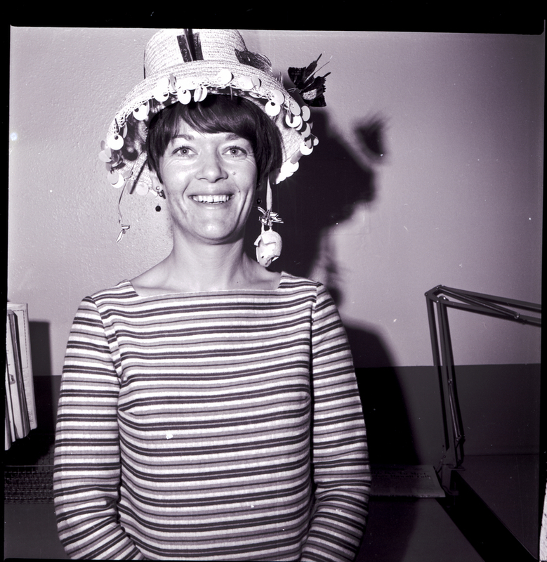 A woman wears a woven hat decorated in butterflies and a chick in an egg. The hat was homemade for Easter and worn during the Ladies of the Elks hat parade.