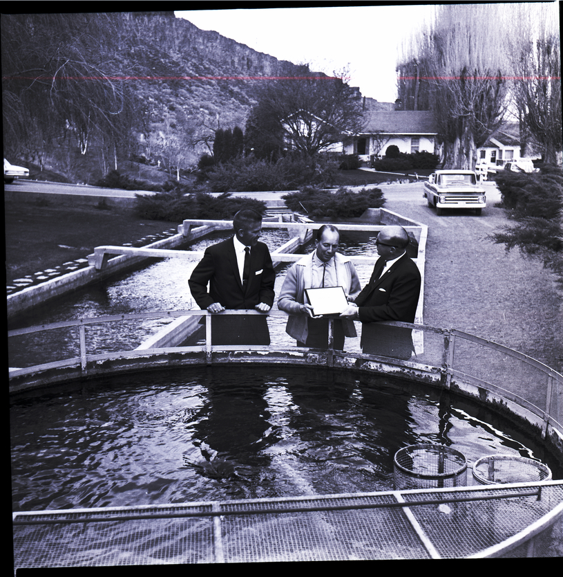 Robert Erkins, owner and operator of the Snake River Trout Company trout farm, is presented an Industrial Indemnity Company Safety Award by Dan Obenchain, right, and Don Elliot, left. In front of them is a trout hatching pond, and more ponds are located to the side. In the distance behind them is a house surrounded by trees and bushes, and a parked pick-up truck sits in a driveway. The walls of the Snake River Canyon surround the hatchery.