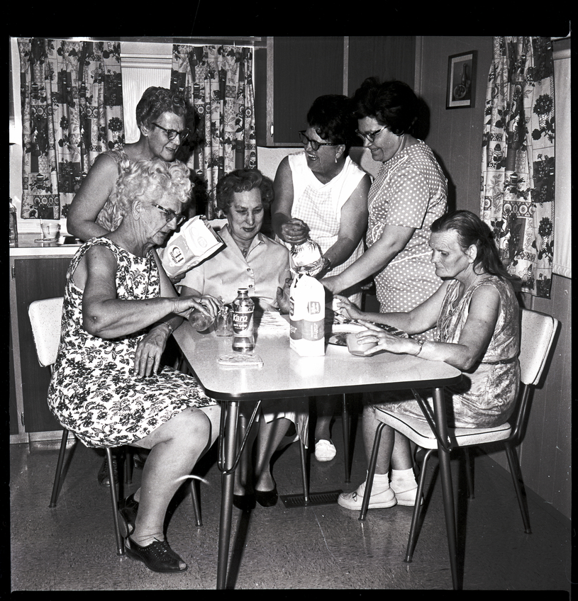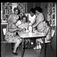 Preparing to make candy to be sent to servicemen are members of the Ladies Auxiliary to the Veterans of Foreign Wars are, seated from left to right, Mrs. Addie Radakovich, Mrs. David Visser, and Mrs. Ivan Waters, and standing from left to right, Mrs. Mae Gardoski, Mrs. John Price, and Mrs. Harold Billings. "Operation Gift Package" is the current project undertaken by the auxiliary in observance of Loyalty Day on the first of May. Packages will be sent to servicemen serving at home and overseas. The candy, made at the home of Mrs. Price, is just one of the items that will be included in the packages. Bags of sugar and bottles of corn syrup are on the table. A kitchen counter and some cabinets are behind them. A window with some colorful drapes is cover the counter. A framed picture hangs on the side wall.