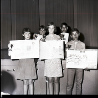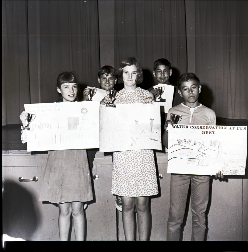 First place winners of the Poster and Essay Contest on soil and water conservation, sponsored by the Twin Falls Soil Conservation District, display their award trophies and winning posters and essays. From left to right, front row, are Debra Lee, Leanne Olmstead, and David Galvin, and back row, Mike Buhner, and Santos Salinas.