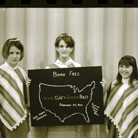 From left to right, Willa Bishop, Karla Barrus, and Evonne Halladay hold up a poster announcing an old-fashioned floor show to be held at the LDS Stakehouse. The girls are dressed in striped ponchos. The poster has an outline of the United States on it, and reads "Born Free, Stake Gold and Green Ball, February 24th, 9:00. Dale Plott's Orchestra. Good ole fashion floor show."