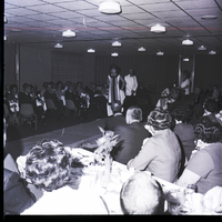 A woman models a striped dress at a fashion show during the Filer Kiwanis Club Ladies' Night held at the Twin Falls Holiday Inn. She walks down a runway with a fountain at the end. Several people sit in chairs at the side of the room, watching. At the back of the room is a table covered in a white tablecloth with a bouquet of flowers on top, and Mrs. Morris Carlson, the narrator of the event, stands behind it.