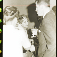 A man and two women enjoy glasses of champagne at the Dilettante's "Sound of Music" opening night champagne dinner, held at the Twin Falls Holiday Inn. Other attendees are visiting in the background.