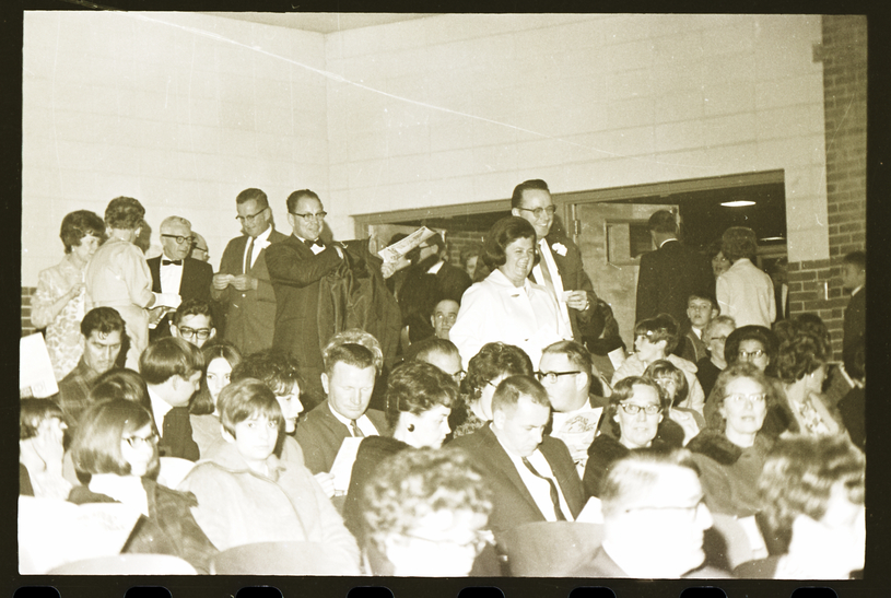 A group of people take seats in the Filer High School auditorium to watch the Dilettante's "Sound of Music" opening night show. Several people are seated and looking at their programs, while others gather in the back of the auditorium visiting before the show starts.