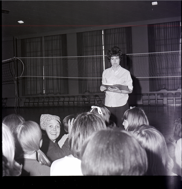 Mrs. Carl Halladay, LDS Stake sports director, stands in front of a volleyball net and explains the rules and regulations at the Stake Volleyball Tournament. Several girls are seated on the floor in front of her, listening. A line of folding chairs are pressed up against the wall at the back of the room.