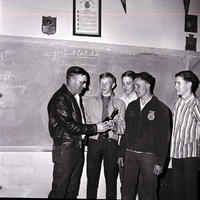 The Murtaugh FFA chapter is awarded with a trophy for winning the East Magic Valley FFA soils and land judging contest. Farnam Warr, supervisor of the West Cassia Soil Conservation District, presents the first place trophy to Mike Howard, while two other members of the winning team, Charles Davis and Joe Jones, watch. In the classroom behind them is a blackboard, and hanging on the wall above it are a plaque and a framed copy of the Future Farmers of America Creed.