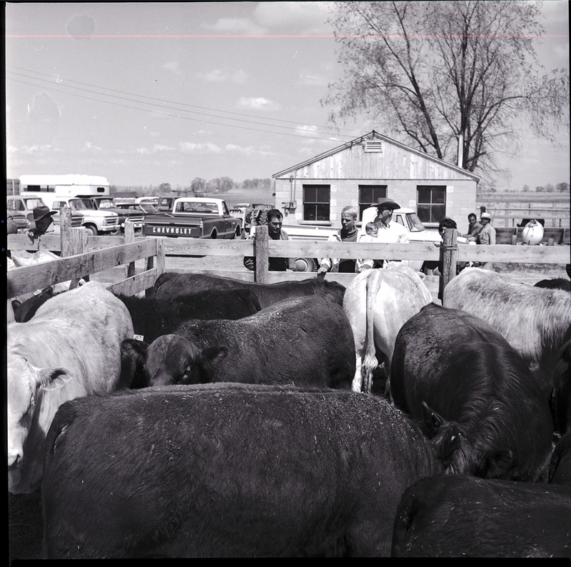 - Several bulls stand in pens at the Jerome Performance Bull Test Station for a bull sale. Several men stand outside the pens, looking at the bulls. In the background are a house with some trees in the front lawn several parked cars.