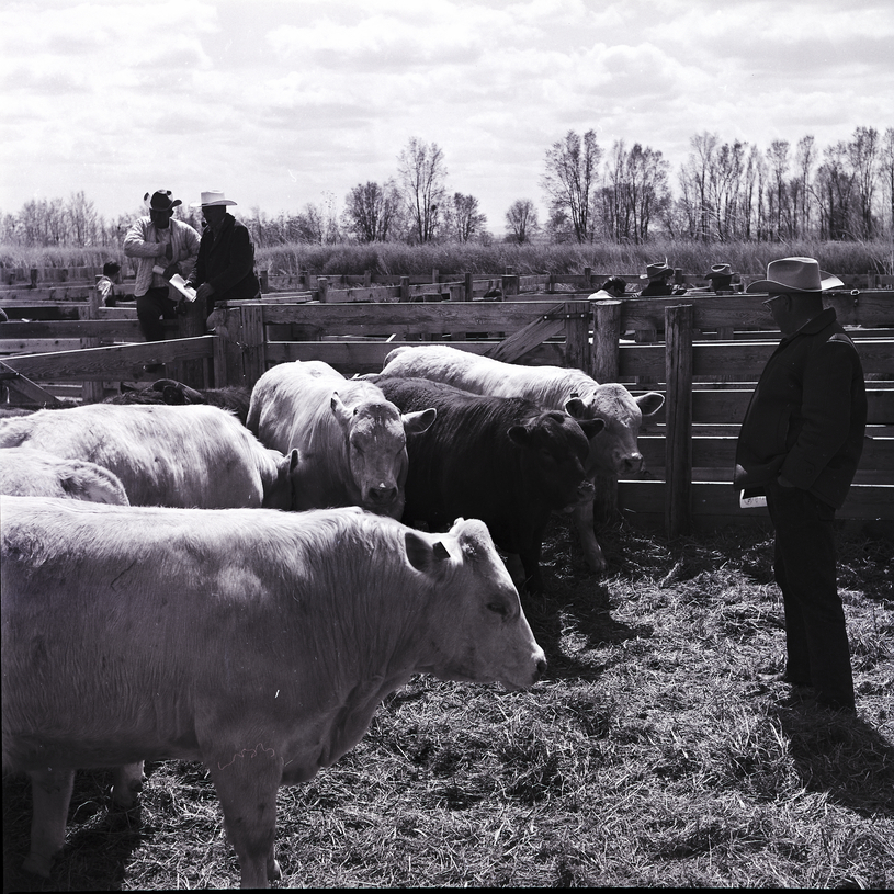 Several bulls stand in pens at the Jerome Performance Bull Test Station for a bull sale. A man in a cowboy hat stands inside one of the pens, looking at the top-gaining bulls. Several men stand outside the pens, looking at the bulls. In the background are several trees.