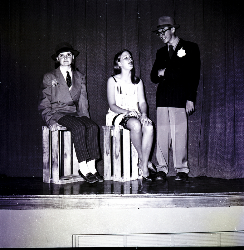 From left to right, Colleen Arrington, Janice Cook, and Mark Golay perform a skit during the Talent Show at O'Leary Junior High School. The girls sit on crates on the stage. Colleen is wearing striped pants, a jacket with a flower on the lapel, a tie, and a hat. Janice is wearing a dress. Mark is dressed in slacks, a jacket, a tie, and a hat. Behind them, the stage curtain is drawn across the stage.