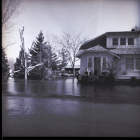 The home of George Trappen is flooded from the Northside Irrigation District Canal break near Jerome. Water surrounds the home. The family Labrador, Lady, sits on the front porch of the home, looking at the water. Several trees around the residence rise up out of the water.
