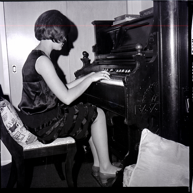 - A woman models a black dress for the upcoming Twin Falls Rotary Club anniversary dinner-dance held at the Blue Lakes Country Club. She is playing a piano.