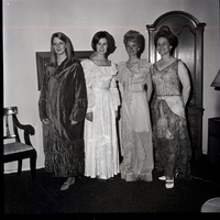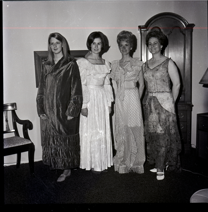 From left to right, Janice Cook, Lynn Havener, Vivian Long, and Glenna Havener model different costume dresses for the upcoming Twin Falls Rotary Club anniversary dinner-dance held at the Blue Lakes Country Club. Behind them is an armoire, a chair, and a framed picture hanging on the wall. On the right side of the room are a dresser and a lamp.