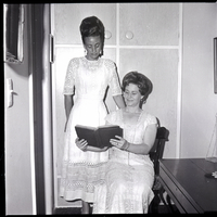 - Two women model white dresses for the upcoming Twin Falls Rotary Club anniversary dinner-dance held at the Blue Lakes Country Club. They look at an old book, and the front cover of the book reads "Kristian Science Hymnal."