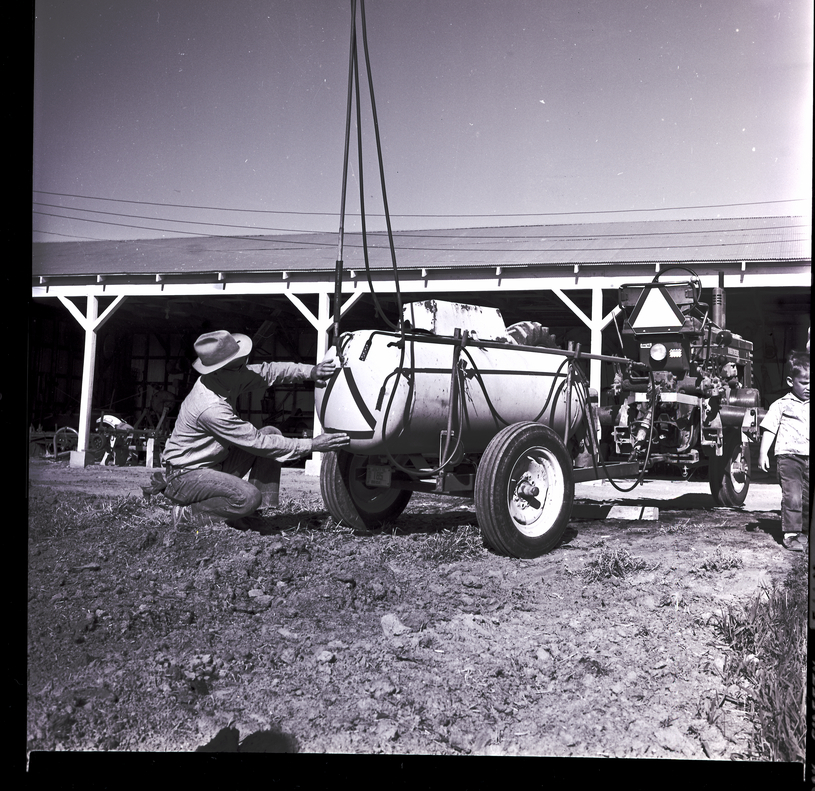 - Kenneth Poe puts a slow moving vehicle safety emblem on a weed burner used for farming. A little boy stands beside the weed burner. Behind them, farm equipment sits under a roofed enclosure.