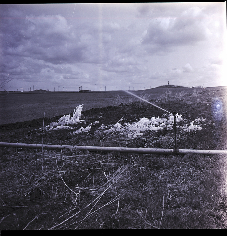 - Ice formations are visible on a field in Jerome county from irrigation sprinklers being left on overnight. Fields and power lines stretch out into the distance.