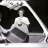 Preparing to go to the state Epsilon Sigma Alpha convention in Lewiston are, from left to right, Alpha Nu chapter members Mrs. Maurice Fuller and Mrs. Richard Johnson. Mrs. Fuller puts a suitcase from the back trunk of a car. Mrs. Johnson stands beside the car, holding several shirts hanging from hangers.
