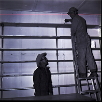 - Mr. Tom Shouse, general manager of the Twin Falls County Fairgrounds, watches Bud Penny paint in the Antiques building. Mr. Shouse is dressed in a jacket and a cowboy hat, and Mr. Penny is dressed in coveralls and a hat and stands on a ladder painting some shelving.