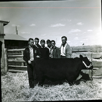The top team in the recent East Magic Valley FFA District's livestock judging contest held at the Jim Brooks Ranch in Hazelton was the Oakley team. From left to right are Chris Baker, Dean Clark, Bill Anderson, Keith Adams, Steven Smith, and J. R. Swan, instructor. The team stands behind a bull. Behind them is a fence, and a barn is in the background.