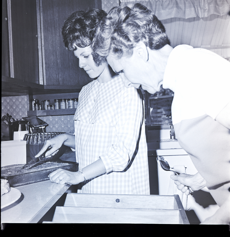 A woman cuts a pan of brownies while another woman retrieves silverware from a kitchen drawer at a party for students of the Idaho State Deaf and Blind School held at the home of Mrs. E. W. McRoberts by the Delta Gamma Alumnae Association. A plate, a bowl of punch, and kitchen utensils sit on the counter top. A spice wrack is located below the kitchen cupboards. At the back of the kitchen is a sink with a curtained window above it.