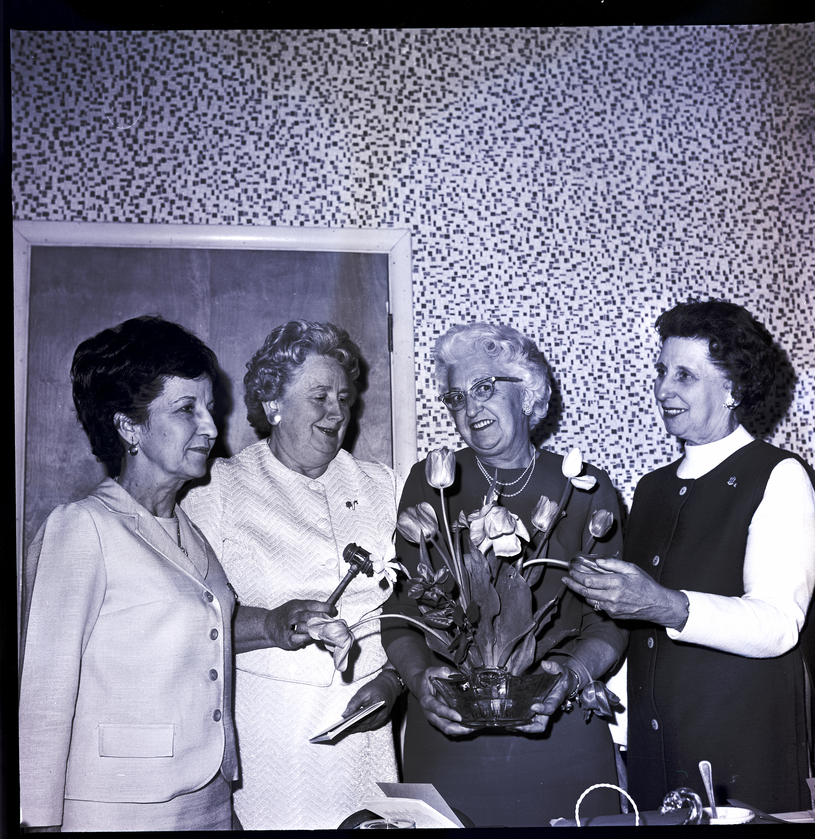 - Four members of Alpha Delta Kappa gather. The woman on the center right holds a vase of tulips, and the woman on the center left holds a gavel and a booklet.