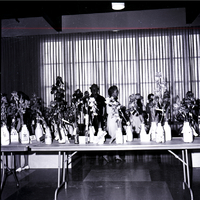 KEL 907 A group of people browse the display of irises at an iris show sponsored by the Magic Valley Iris Society and held at the Twin Falls YMYWCA. A long table is covered in jars filled with irises, and several have award ribbons attached to the jar.