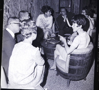 KEL 902 A group of people are gathered in chairs around a round table enjoying drinks at a Farewell Party for Merl Eden, held at the home of Tommy Walker. An ash tray, glasses, and napkins are on the table. Second from the left is Merl Eden, and third and fourth from the left are Mrs. and Mrs. Duke Wiseman.