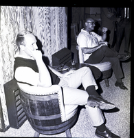KEL 902 001 From left to right, Ron Watson and John Campbell sit in chairs at a Farewell Party for Merl Eden held at the home of Tommy Walker. A round table is between them, and on the table are two glasses and an ash tray. Some other men are seen visiting at the back of the room.